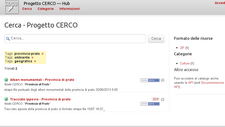 By clicking on one of those entries you may further filter the current set of metadata. For instance, if you click on tag “provincia-prato”, you’ll only get the datasets which are tagged this way; you may iterate the filtering in order to restrict your research.